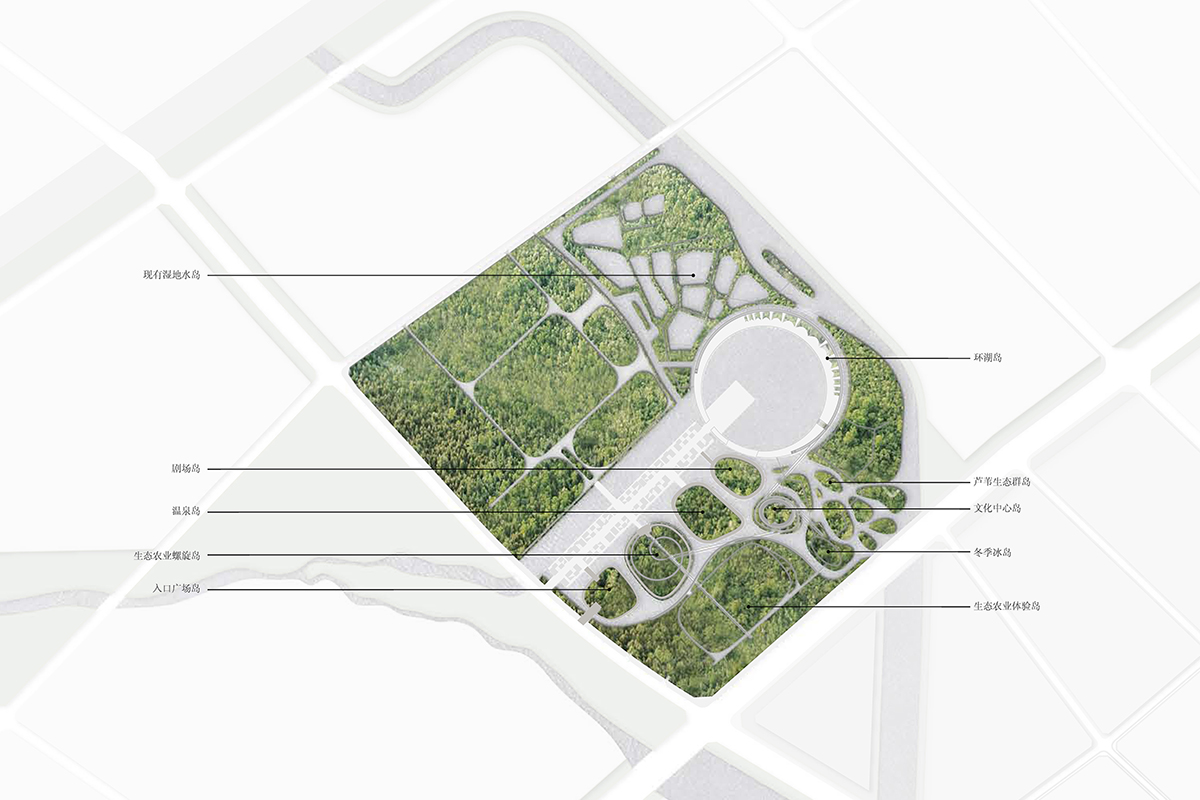 The water islands in the existing wetlands have a unique character and charm; this project aims to protect the existing ecology by maximally maintaining the existing wetlands and water islands;we use the water network in place of the road network to design unique green islands, and give each island a different character.Through the same ecological thematic idea, the islands are sorted into organically and closely related ecological tribes.
