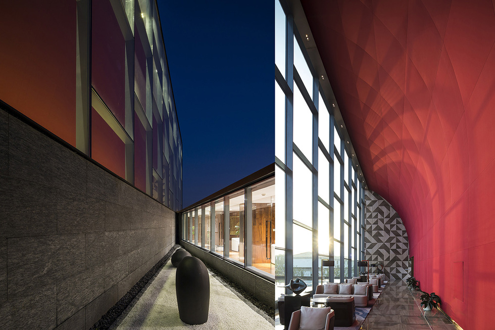 The retreat of the building's lower space creates a light and floating feeling, and the second floor's cantilever provides ample exhibition space. The core of the building is a vertical transportation flow space, with sustainable green vegetation walls that allow external light to indirectly penetrate the building interior through the top floor. From the bottom to the top, the light becomes brighter and the surrounding landscape becomes more visible, creating a positive and uplifting atmosphere. Standing on the roof and looking out at the Lion Mountain and Yuejiang Tower, one's mood is lifted.
